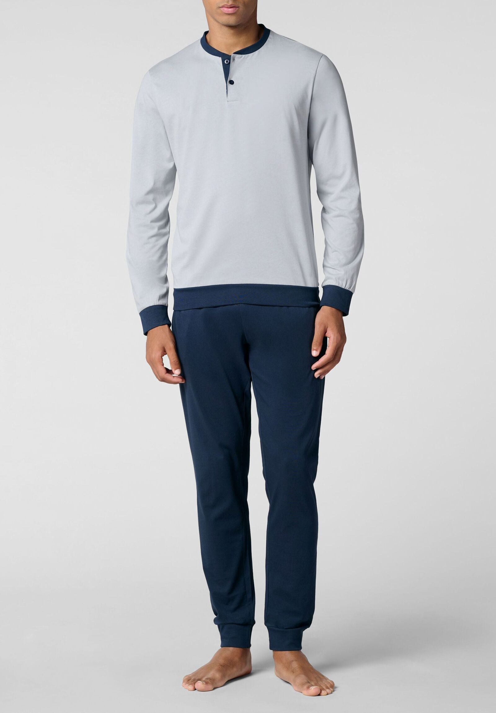 Pigiama lungo realizzato in jersey di cotone, leggero e morbido. Un pigiama dallo stile essenziale, ma raffinato e caratterizzato da colori brillanti. Sia la maglia che i pantaloni hanno pratici polsini. La maglia ha una taschina, così come i pantaloni che hanno una tasca sul dietro. Il pigiama perfetto per la primavera ma adatto anche a chi preferisce indossare un pigiama in cotone leggero in qualsiasi stagione.