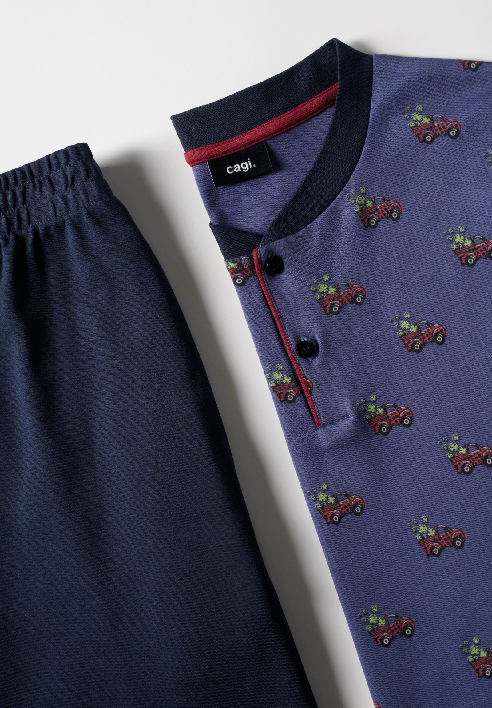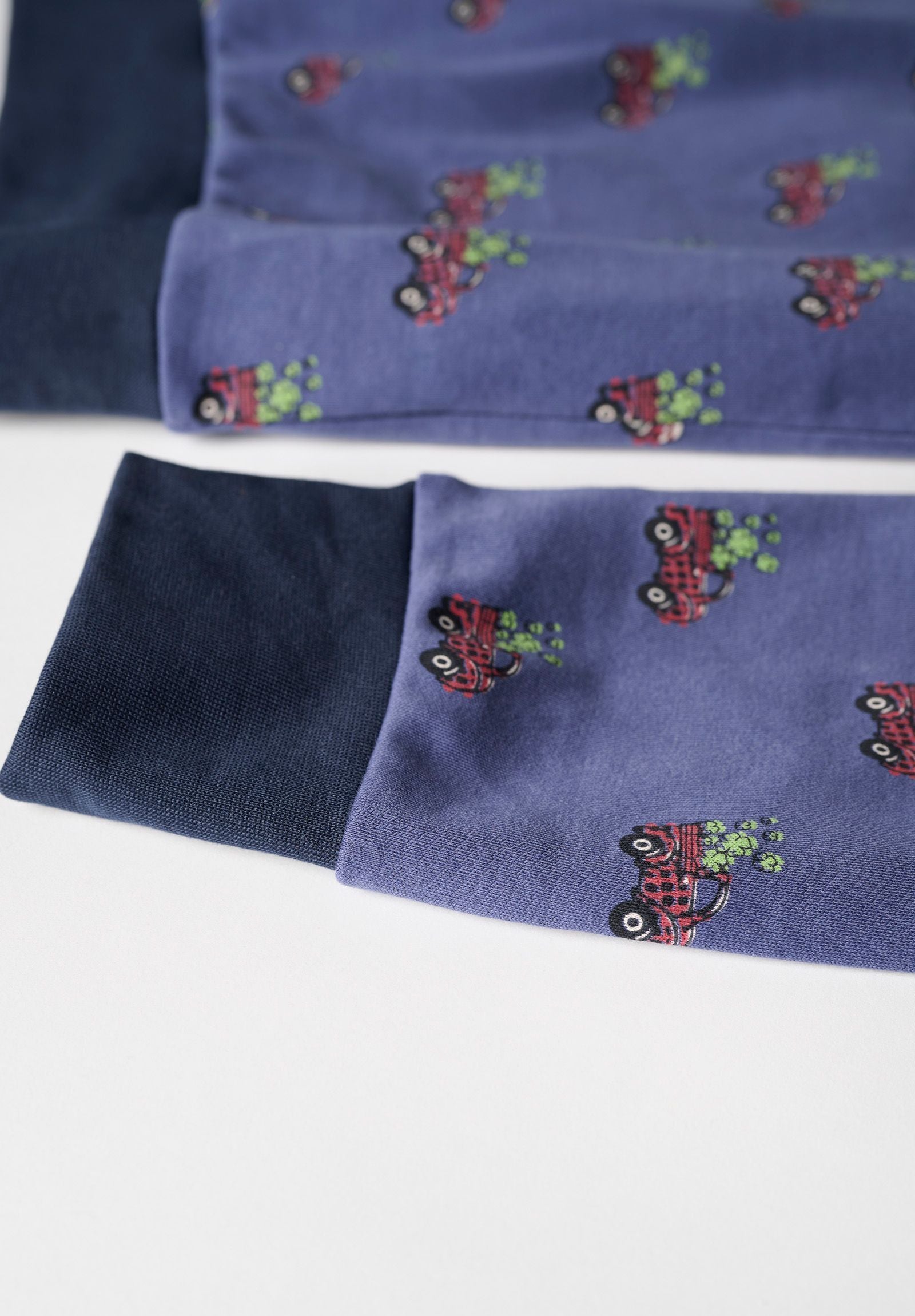 Scopri il pigiama serafino lungo con stampa portafortuna, pensato per unire stile, comfort e dettagli curati. Realizzato in morbido interlock di cotone, è ideale per l’inverno grazie alla sua struttura calda e avvolgente.La maglia presenta una vivace stampa portafortuna su fondo blu e una comoda abbottonatura serafino, con parasudore a contrasto e apertura collo rifinita con dettaglio colorato. I polsini e il fondo maglia sono in tinta unita, perfettamente coordinati ai pantaloni per un look armonioso e moderno.I pantaloni in tinta scura sono dotati di pratiche tasche laterali e polsini alla caviglia che migliorano la vestibilità, mantenendo il calore durante la notte. Un pigiama pensato per chi vuole sentirsi a proprio agio, con un tocco di originalità anche nei momenti di relax.